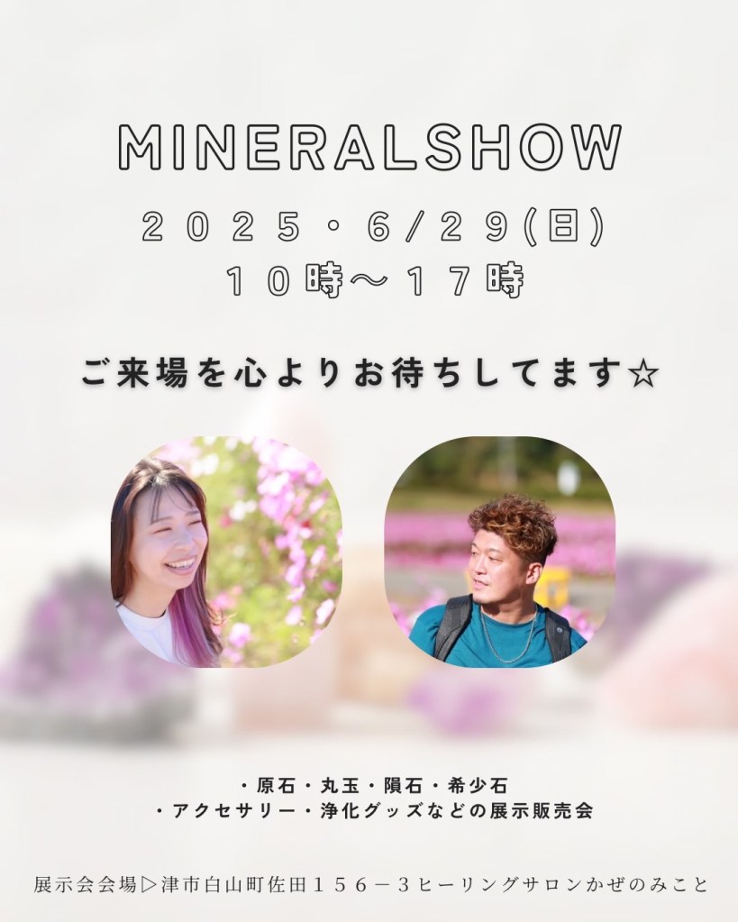 原石・丸玉・隕石・浄化グッズ・ブレスレットなどの販売と事前チャネリン事前よってエネルギーを天然石ヒーリング、天然石のお守りつくりなどを行います。世界中の原石を集めて天然石の楽しい世界を開催します。