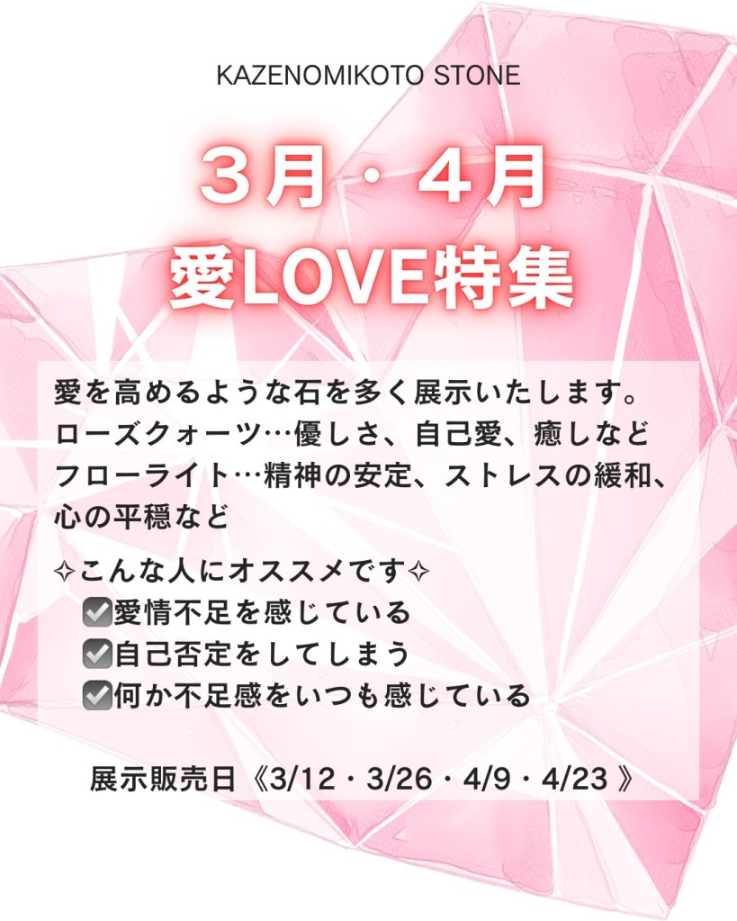 天然石の販売では毎月テーマをもって販売しています。 3.4月は愛LOVEの特徴を持った天然石を多めに展示しています。もちろん、他の天然石、浄化グッズなども多く販売しております。